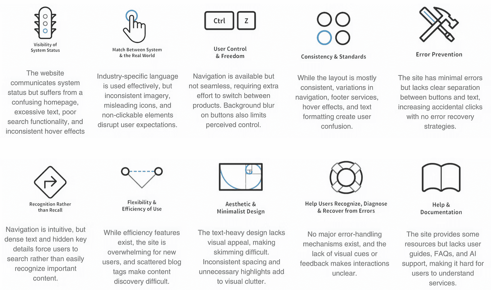 To identify usability gaps in Megaputer’s existing website, a heuristic evaluation was conducted using Jakob Nielsen’s ten heuristics. It revealed issues like cluttered layouts, inconsistent navigation, unclear visual hierarchy, and poor feedback, forming the basis for a more intuitive and consistent redesign.